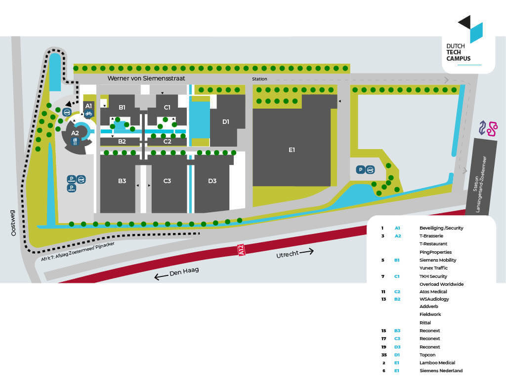 Dutch Tech Campus is een thuisbasis voor nationale en internationale smart technology bedrijven die zich richten op het snijvlak van Communicatie Technologie en Infrastructuur. Gerenommeerde technologiebedrijven als TopCon, TKH Security, Lamboo Medical, Yunex Traffic, Siemens, Reconext en WS Audiology zijn gevestigd op de Dutch Tech Campus.